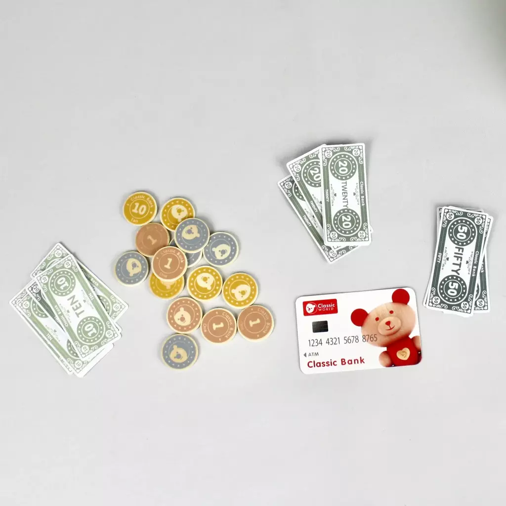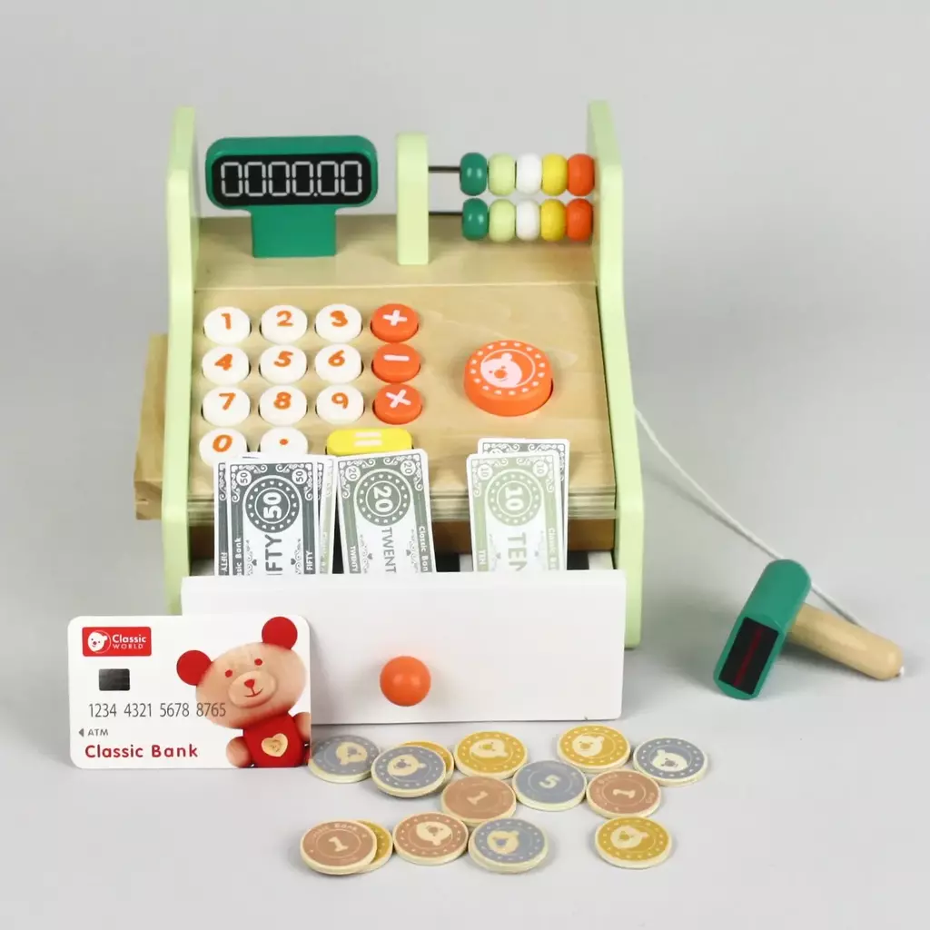 Características principales: - Material: Madera resistente y duradera. - Edad recomendada: 3 años en adelante. - Tamaño compacto: 20 x 19 cm, ideal para manos pequeñas. - Incluye: botones numéricos y aritméticos, miniábaco, tarjeta bancaria, monedas y billetes. - Estimula la imaginación, la coordinación y el aprendizaje de conceptos matemáticos y monetarios.