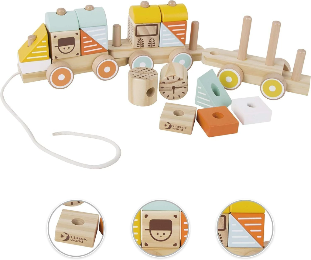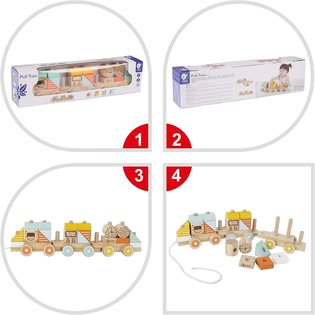 Cada vagón invita a encajar diferentes figuras, lo que mejora la coordinación mano-ojo y promueve el desarrollo psicomotor. Además, el tren se puede arrastrar fácilmente, motivando al niño a dar sus primeros pasos con confianza y alegría.