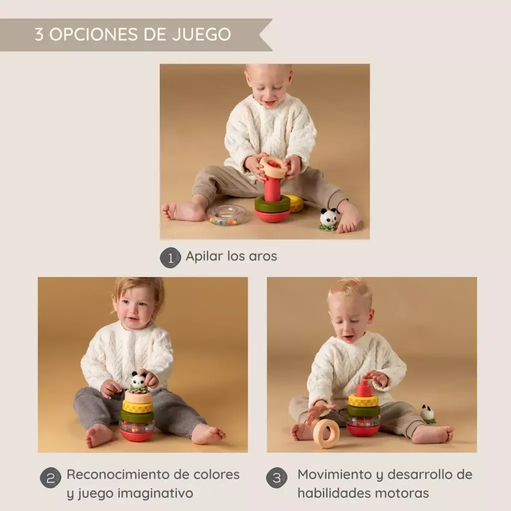 Este apilador es mucho más que un simple juguete: es una herramienta que acompaña el crecimiento de tu hijo, promoviendo habilidades esenciales mientras se divierte. Además, gracias a su adorable cabeza de panda, ¡será el compañero de juegos favorito en cada etapa!